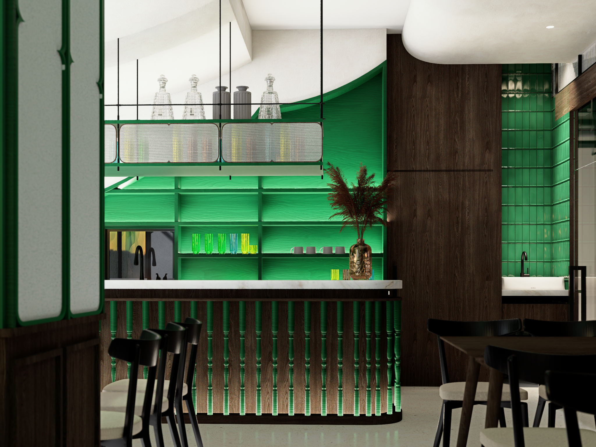 ในการ ออกแบบตกแต่งภายใน ครั้งนี้ ทีมสถาปนิก Living Inhabit ได้นำสีเขียวประจำแบรนด์ (Signature Green) มาเป็นหัวใจหลักในการเล่าเรื่อง เพื่อสร้างภาพจำที่ชัดเจนและสะท้อนความสดใหม่ตามมาตรฐานอาหารฮาลาล ภายใต้คอนเซปต์ “Modern Contemporary Thai” เราใช้เทคนิคการ ออกแบบภายใน โดยไล่ระดับเฉดสีเขียว (Layering Green) ผ่านวัสดุธรรมชาติ เช่น งานจักสานสีเขียวและงานไม้ เพื่อสร้างบรรยากาศที่ดูอบอุ่น เข้าถึงง่าย แต่ยังคงความหรูหราแบบ Urban สอดคล้องกับตำแหน่ง บริษัทออกแบบ ชั้นนำที่เน้นความแตกต่าง