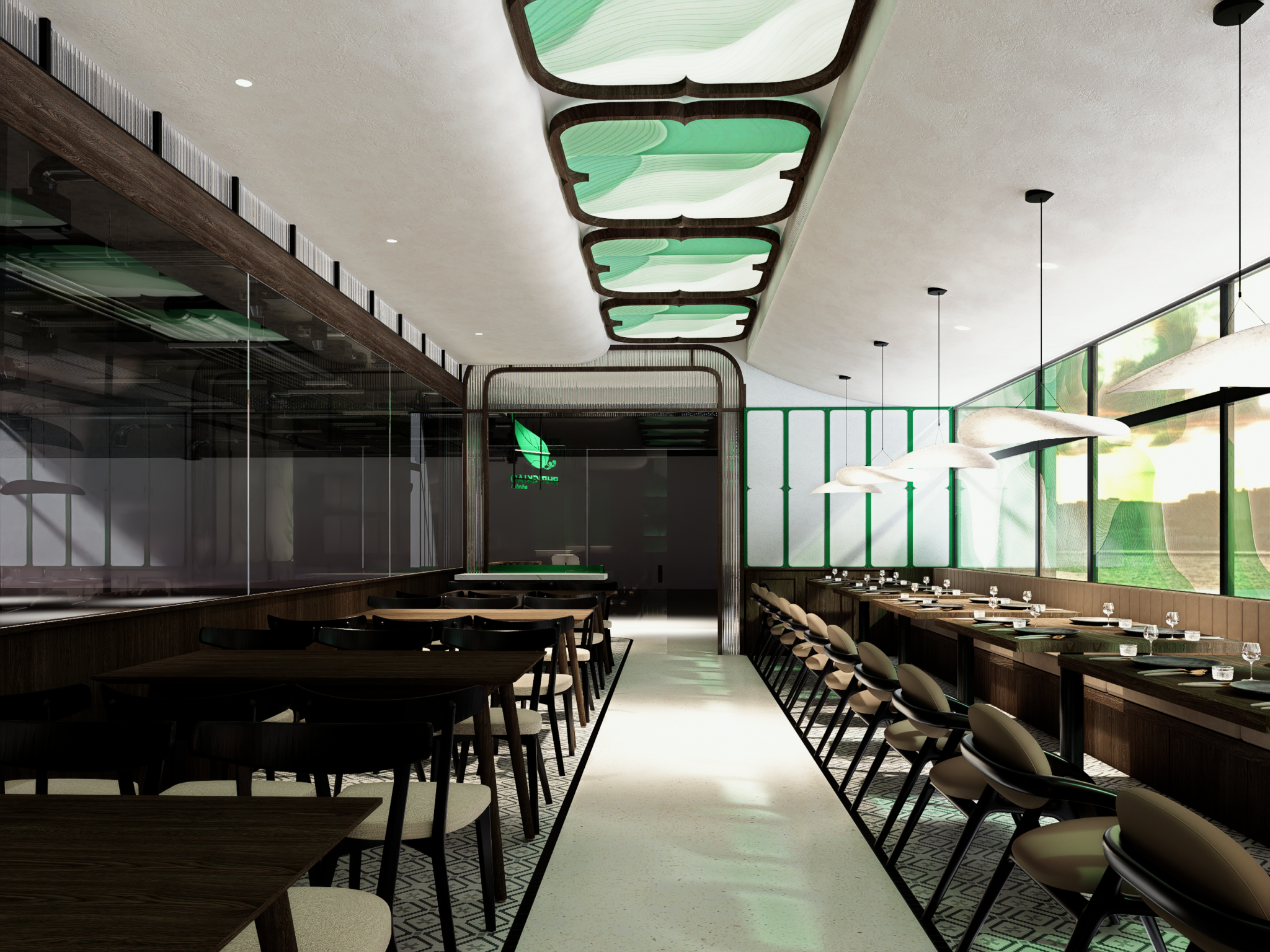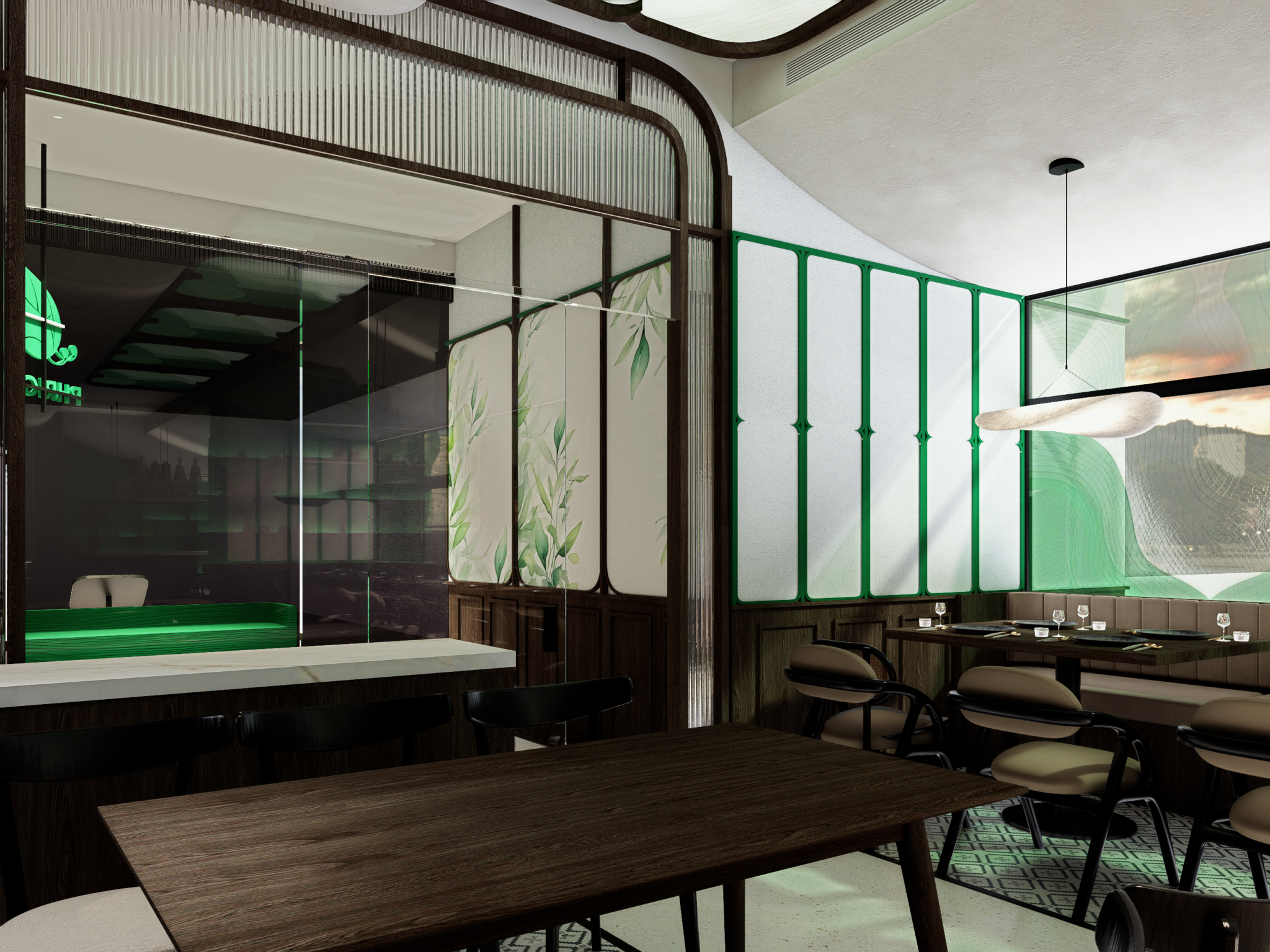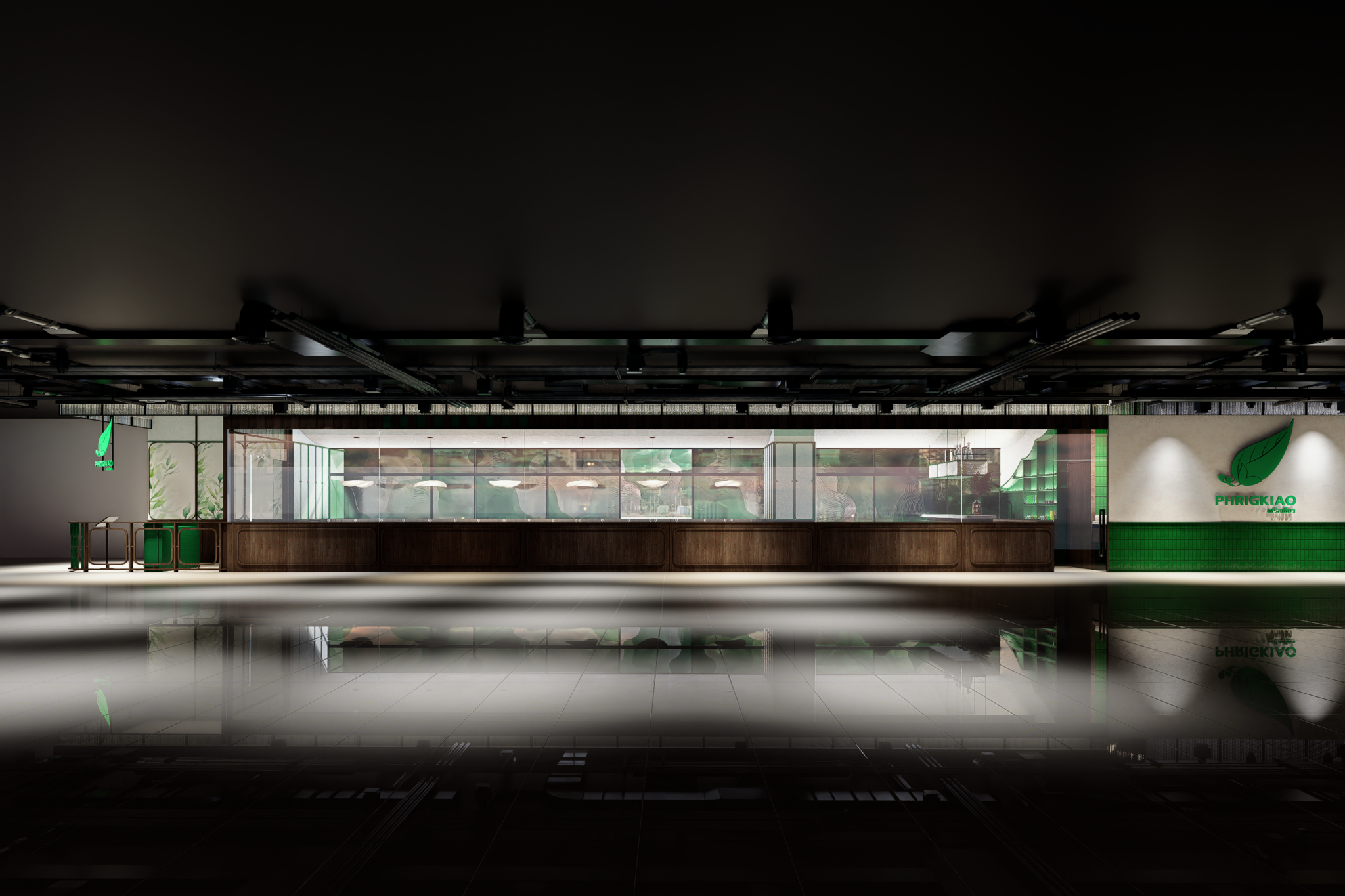 แสง: ใช้ Warm White เป็นหลักเพื่อให้อาหารดูน่าทาน และเพิ่มไฟ Linear Green เพื่อสร้างเอกลักษณ์ยามค่ำคืน