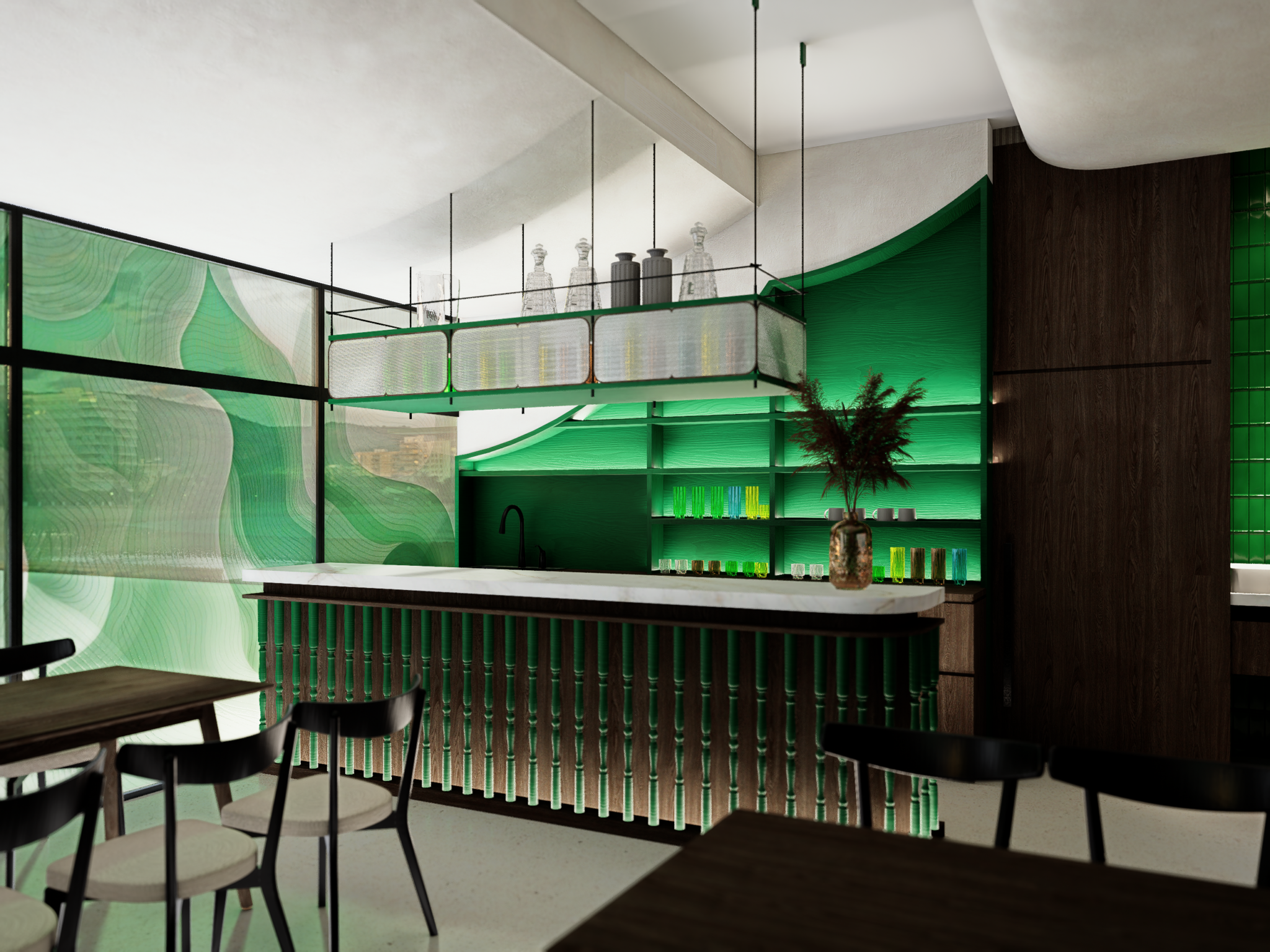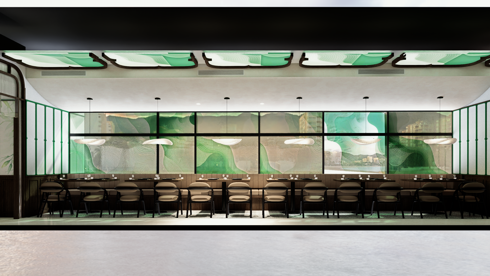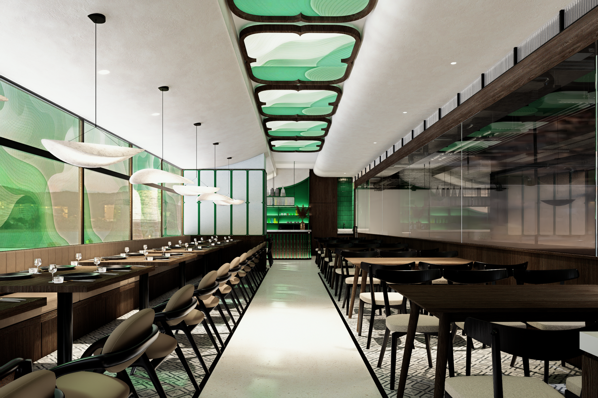 แสง: ใช้ Warm White เป็นหลักเพื่อให้อาหารดูน่าทาน และเพิ่มไฟ Linear Green เพื่อสร้างเอกลักษณ์ยามค่ำคืน